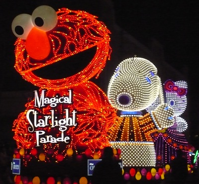 夜7時半からパレードを見ました。 パレードの始めと最後の2度見えるというネットで下調べした 場所に7時20分に行くと最前列にレジャーシートを敷いて 座っている人がいるだけでしたので、2列目に陣取れました。 写真やビデオは立って撮ったほうがよく撮れるので、 立ち見の最前列で、逆にラッキーでした。 主人はビデオ、私は写真を何枚も撮りました。 キラキラ輝く美しいパレードに時の経つのも忘れて 感動の一時を過ごせました。