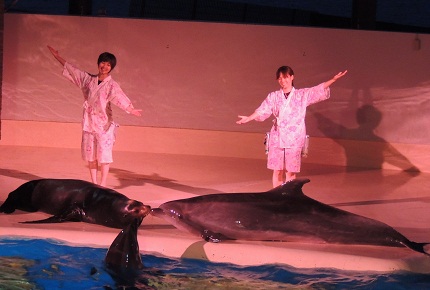7月29日の夜は海峡ゆめタワーからタクシーで移動して、 海響館に行きました。 イルカとアシカのショーでラブリーなキスシーンが見えました。 ペンギンがとっても可愛かったです。 夜の水族館は素敵でした。 ペンギンの衣裳が置いてあったので娘に着せちゃいました。