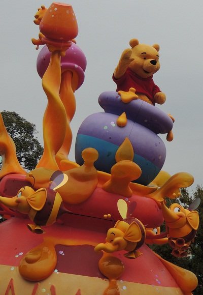 ディズニーランド30周年のパレード『ハピネス・イズ・ヒア』が 終わるとすぐにプーさんのハニーハントに並びました。 11時半に100分待ちだったのが3時半には80分待ちでした。 そして、運が良い事にトゥーンタウンに入って行くパレードが ハニーハントに並んでいる最中にもう一度再び見えました。 ハニーハントはとっても面白かったです。 私は昔からプーさんが大好きで、ハイテンションになったせいか お土産をどっさり買ってしまいましたw
