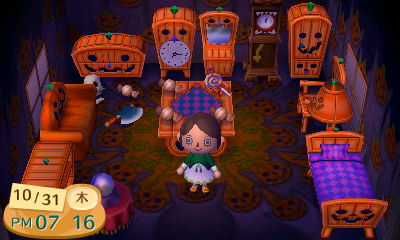 どうぶつの森でハロウィンを楽しみました。 10月31日は村のハロウィンのお祭りです。 村人とゲームして勝つとアメが貰えるので、 パンプキングにアメを貢ぎ、家具を貰って、 ハロウィンの部屋を作りました。