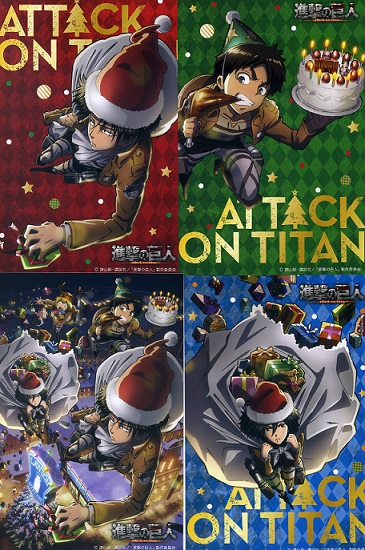 ローソン進撃の巨人キャンペーンでクリスマスカード全4種 コンプリートしました。 進撃のお菓子をいっぱい買いました。 飲み終わった後、捨てるのがもったいなくて ダイニングテーブルに紙パックの兵長を 飾っていますw