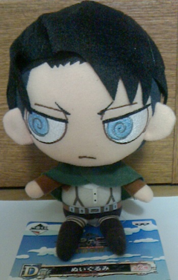 進撃の巨人一番くじD賞ぬいぐるみ当たりました。 リヴァイさんを手に入れる事ができて嬉しいです。 今回は5千円でB賞以外各賞1~3個当たりました。 リヴァイクッションとエレンぬいぐるみは当たらなかったものの ぬいぐるみ兵長とエレンクッションが当たったので大満足でした。