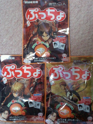 進撃の巨人のぷっちょを買いました。 貼って剝がせるキャラクターシールは リヴァイさん出ました。 エルヴィンとクリスタちゃんも出ました。