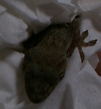 子供部屋にヤモリが出現しました。 6時半頃に娘の悲鳴が聞こえたので、びっくりして見に行くと 「何かいる!変なのがいる!虫じゃない!」 と娘が言うのです。虫かと思ったのに何だろうと考えて、 イモリかヤモリかなと思って、娘に聞いてみると、 「トカゲみたいなの」と言うので、ヤモリだと思います。 最初、見当たらないので、玩具とかカバンとかどかしたら 出てきました。ティッシュを手に持って捕まえようとして、 追いまわして机の下まで追い込んで何とか捕まえました。 ヤモリが私の家の中に現れるなんて、数年に1回しかない 珍しい事です。生け捕りにしたのは初めてです。 記念に写メを撮りました。 主人が「ペットボトルに入れて飼うか?」って言いましたが、 階段を下りて玄関から外に出て道路に捨ててきました。