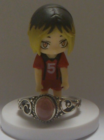 ハイキュー!!デスクトップフィギュア研磨くん出ました。 輪ゴムかけなのですが・・・ 先日、半額閉店セールで購入したインカローズの指輪を かけてみました。 指輪かけにされて、研磨くん不満そうな顔してる気がしますw