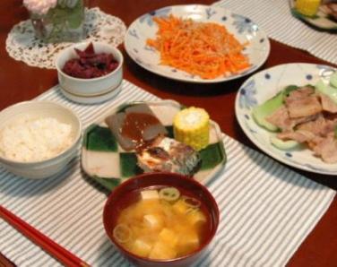 昔の日本人は一汁一菜でご飯の比重が大きかったといいますね。栄養学的には 一汁三菜がいいらしいのですが、ちょっと多くなりがち。さばの塩焼き、味噌田楽、とうもろこし豆腐とかぼちゃのお味噌汁(青梗菜と塩焼き豚肉にんにく風味 人参きんぴら)ご飯は発芽胚芽米「月山まんま」を白米2:1まんまで。香のものは古しば漬け胚芽米や玄米を混ぜると、しっかりとした食感になるせいかよく噛んでいただくせいか、早くにお腹がいっぱいになり、プチダイエットとなっているような気がします。話題の「ビリー」隊長の部隊に入隊は無理だから悪あがきではありますが、健康にもよいし、発芽胚芽米のごはんに燃えています。(脂肪にも燃えてほしいんだけどね) わたしのお昼はこれで十分一瓶三香♪たまに、こんなのがあるとなお嬉しい・・・