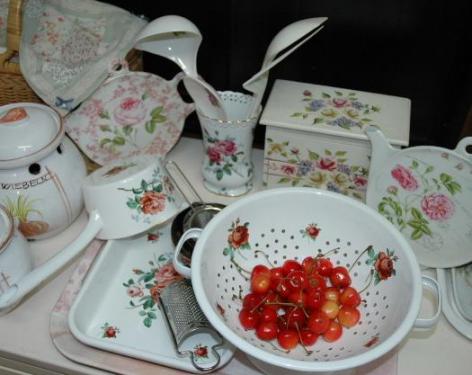 昨日はほんと、暑くてだるくて、いや~なお天気でした。この季節はとても苦手、体がだるくなると元気もでなくなるから、なんとかせねば、ともがいております。一昨日、お嫁ちゃんがさくらんぼを一杯送ってきてくれました。長男のお嫁ちゃんとは、おかげさまですご~~く仲良しです。主人もわたしも、彼女のこと、可愛くってしょうがなくって~。女の子がひとり授かったって感じで、息子そっちのけ(笑)^^;息子の出張土産のさくらんぼを送ってきてくれたので、甘くて美味しくて、嬉しくなって記念撮影したら梅雨のうっとうしい気分がちょっとさわやかになりました。食べる前に写せばよかったなあ~というのが、ちょっとした後悔ではありますが^^; お台所の一角のバラづくし台所用品も私と同じく古くなってきたので、思い切って、楽しいものに少しづつ買い換えています。薔薇とレースと天使のお店