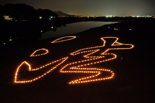 河原で盆燈絵(紀の川)(和歌山県 紀の川市竹房)8/15日に、紀の川市の竹房橋で盆燈絵が開催されると 久しぶりの友達から電話かかかってきて、来るようにと誘われて、急に車を走らせて、行ってきました。☆ 橋の上から、河原に書かれた盆燈絵の「法」の文字が綺麗に現れれました。ISO 100 8Sce F4.0 でしたので、橋の揺れが入っていまい、失敗です。次回は、ISO 800 位かなと思っています。 -- -- 文字の作者は、日本書芸院 笠野宗法氏らしいです。法の文字は、700余個で作られたと聞きました。流し灯籠は、100個を繋いで川面を流れました。 ”おまけの画像 ” このような盆燈が、河原に配置されていました。☆ 愛犬ぱぱさんのオススメ ☆喉ごし爽やかミネラルウォーター日田天領水甘くて美味しいトマトジュースオオカミの桃