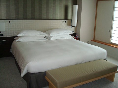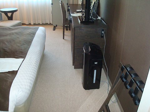 ベッドルーム。考えてみれば私はこのベッドルームだけで十分。でもこれだけだとちょっと狭いかなたぶんもともと2つあった部屋を改装してスイートルームにしたものではないかと思われますがその一部屋ずつがやっぱりちょっと狭いのでスイートルームといってもなんだか閉塞感も感じてしまう。たぶんもっと窓が大きくて明るかったら違うのかも。ふうう私の情報収集不足です。窓が小さいことは分かっていたしHPからスイートルームでも11階から38階まであると分かっていたのに半額で泊まるのだから低層階になることは予測できることでした。どうしてこのホテルを,この部屋を選んでしまったのだろう。ホテルが悪いんじゃありません。スイートルームという言葉に魅かれなんだか分からない期待を抱いていた私が悪いのです。部屋が二つあるだけ!!大きなTV。クローゼットの中。枕元にはヒルトンベア。