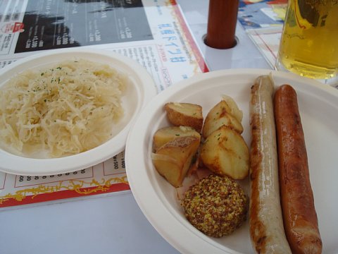 札幌の街を歩いていたらまた大通公園のビアガーデンにひきつけられてしまいました。実はドイツで食べたブルストとそれの付け合わせのザワークラウトが忘れられず特にザワークラウトが食べたくなったのです。さっぽろ大通ビアガーデンはサントリー,アサヒ,キリン,サッポロの4つに世界のビール広場と札幌ドイツ村の2つが加わった6つの会場がそれぞれ1店舗ごとに分かれてあります。おつまみなども持ち込み不可。札幌ドイツ村は,大通公園の11丁目にありました。今回は,ザワークラウトがメインなのでミニサイズのドイツビールを・・・と思っていたらメニューに「飲み比べセット」を発見!!飲みたくなりました。やっぱり注文しちゃった。私は,このシュバーテンミュンヘナーヘルが好きな味でした。ちょっとだけのつもりがまたまたいっぱい飲んでしまった~~~。やっぱり青空の下でのむビールはおいしい。昼間に外で飲めるって旅ならではですね。