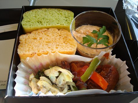 ANA67便 プレミアムクラスなんとまたビールにしてしまった。朝のスパークリングワインから始まりこれでビールは3杯目。軽食2種のフォカッチャ(ホウレンソウ風味,赤ピーマン風味)チーズディップソースあさりとモロヘイヤのにんにく風味マグロのマリネ261kcalもうひと箱のお菓子は持ち帰りができたので旅先のホテルで食べました。プレーンカップケーキチェコレートフィナンシェマンゴーラングドシャ