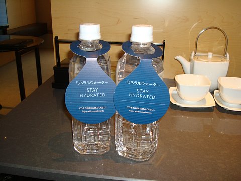 リビングルームにはサービスの水とコーヒーメーカー。冷蔵庫の中の写真は珍しく撮ってません。ドリンク類が入っていましたもちろん有料。