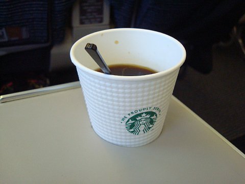 ANA64便プレミアムクラス。ドリンクはスタバのコーヒーにしました。プレミアムデリはサンドイッチトルティーヤフルーツなど。これ↑は持ち帰りました。
