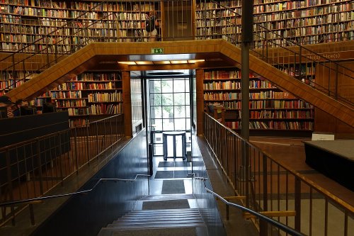 ストックホルム市立図書館。入口から入って振り返って見たところ。ずっと前,ネットでこの図書館の画像を見てからここに来たいと思っていました。この図書館に来るために旅先にストックホルムを入れたのです。一目ぼれに近いこの図書館をこの目で見ることができました。円形の3階構成の書棚。360°ぐるっと本棚が並びます。本好きにはたまらない。写真はクリックで大きな画像になります。ぜひ見てみてください!大きな画像の方が雰囲気が伝わります。