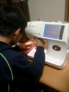 私の嫁入り道具のミシンを久々出してきて作っている長男。