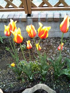 花粉症の私にとって、春は憂鬱な季節だけど唯一、私の気持ちがウキウキしてくるもの。それは、お花が元気よく咲いてくる季節今年はパンジーは種からは育てなかったけれどチューリップの球根が芽を出して、今は満開です。庭の一部をご紹介何種類か植えた中で、この種類が一番綺麗に咲きました。画像では、まだ最初の頃なのでたくさん咲いていないのだけど今は一つの球根から5つくらいつぼみがついて結構見ごたえがあり、背もすごく高くなりました。あとはパンジー、ゼラニュームをはじめ、お庭と玄関周りには今たくさんの色のお花が私の心を和ませてくれています。最近は3才の娘が、水やりをしたがるので助かって(?)います。そして、先日猫の額くらいの狭い庭にピーマンの苗を植えました。大好きな息子がたくさん食べられるように夏が楽しみだわー