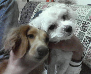 先日、義妹の1歳になる息子、要はたんたんの従姉弟にあたるお子ちゃまの誕生会で旦那の実家に出向いたときの写真です。右が我が家のはっちゃん。左が旦那の3人兄弟の真ん中の妹の飼い犬、テンちゃんです。あまりのやんちゃっぷりに痺れをきらした旦那が2匹を捕獲した写真です。どちらもすごくやんちゃだけど甘えん坊&やきもちやき。テンが私の膝に座ろうものならはっちゃんはものすごい勢いでテンに絡み、そこからやんちゃな遊びに発展します。テンにはお嫁さんがいて、じつはそのお嫁さんが妊娠中です♪ダップルでとてもかわいいお嫁さんなのでかわいい子が生まれることは絶対ですね。ダックスの歩き方もにょろにょろしてて可愛い^^ダップルファンのワタシにとっては目に入れても痛くない!!というか犬ってやっぱり可愛いですね。子供が生まれたら一匹いただくことになりました。楽しみだなぁ~。