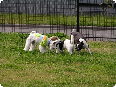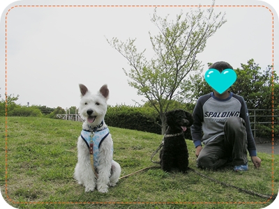 午前中は高校の授業参観&父母会に行ってきました。同じ時間、小学校の災害時引渡し訓練だったので、そちらは旦那に行ってもらいました。そして午後は、市のドックランへ行ってきました。ドックランデビューです(私が ^^;)シュナは前の飼い主さんと行ってたのかもしれません。とっても上手に遊んでました(^▽^)特に、このジャックラッセルテリア君とは気があったみたいです。遊んでる途中でも、こちらをチラチラ見てちゃんとチェック!呼べば寄ります♪でも、しつけずほって置いた「飛びつき」がダメダメでした(><)家族にはまあいい・・・でも、愛想フリフリのシュナは、あちらの飼い主さんこちらの飼い主さんにもご挨拶に回ります汚れた足で飛びつきますぅ~~~ズボン汚してごめんなさい(--;)甘噛み、リードの引きもしつけ中ですが、飛びつきも止めさせないとね!