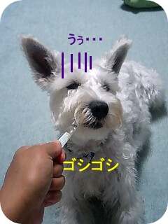 最近のワンコは歯磨きもしなければならないのヨ・・・そりゃぁ嫌だよねうんうん。子供たちも噛んで反抗したっけ(笑)じゃあ、昔懐かしいしま○ろう風の歌でも歌いましょうか大きくあ~ん♪ シュッシュッシュ~~♪ムシばい菌をやっつけろ~♪「おかあさんと一緒」風の歌も交えながら(笑)前歯もイー♪仕上げはおか~あさん♪そう言えば、しま○ろうのパペットも効果があったな♪パペットはもう無いから、この子が登場~「ほら、カエルさんも上手だよ~」ワンコの歯磨きやってます?↓ポチよろしくお願いしますにほんブログ村