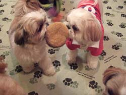 今日はなにやら親子それぞれで集中しております。その訳は・・・・・新しいおもちゃを配給したからです。トトロが持っているのはHartz デンタルトーイ チューインクリーン ツイストびびちゃんががじってるのはHartz デンタルトーイ チューインクリーン リングそしてめいちゃんが隠して楽しんでいるのはHartz(ハーツ) チューインクリーン Sです。実はトトロ、そんなにハーツ社のデンタルトーイは好きじゃないんです。でも新し物好きだからとりあえず一番初めにGETしないと気がすまない性分であります。そしてまたまた詰めが甘い!!!トトロ君!ひとり入り口の方に顔を向けてるから、すぐに娘の荒くれがっちゃんに取られてしまいました(*´Д`)=з娘たちはちゃんと後ろ向いてガード固めてるのにね・・・本当はこれが一番のお気に入り♪ 東京ペット デンタルコング S
