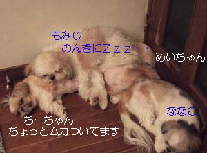 今朝、リビングで見たものは↓↓お姉さんの上でグッスリの紅葉の姿・・・ちーちゃんがギロリとにらんでますよーく見るとめいちゃんもいるんですこれはもみちゃんだから許される行為なんですでも重たいから降りてあげようね、もみちゃん!