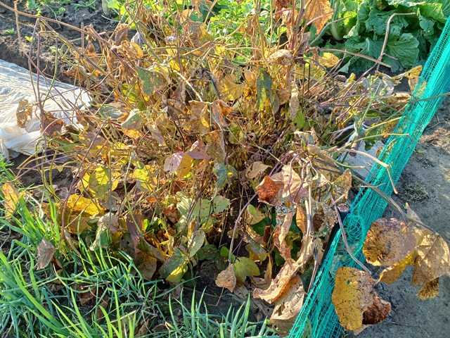 インゲン豆は毎日取れています。採るときに葉を動かすので大分葉が傷んでいます。採り残しをすると大きくなってしまい、筋が出てくるので廃棄しています。収穫をしていると実がかじられているものが多くありました。実を食べている虫を発見。これは少し前キャベツにいたのと同じ虫です。尺取り虫のような形です。なんという虫でしょうね?エダマメは肴豆は収穫が終わり、丹波の黒豆を収穫していましたが実が黄色くなってきたので、エダマメとしては今回で終了し大豆としてすべて収穫にしました。莢を外して家で乾燥します。左が大豆用、右が最後のエダマメ用、エダマメ用は少し緑色が強いですがわかりにくいですかね。残りは採取用の株です。肴豆はすでに乾燥している莢があったので、もぎ取り家で乾燥します。家での乾燥状況です。このままカーポートの下で放置し乾燥します。夏野菜は少なくなってきて、秋野菜が増えてきました。ニンジンは出来は良くありません。長ネギは35~40cmのものが出てきました。ランキングに参加しています。クリックよろしくお願いします。にほんブログ村