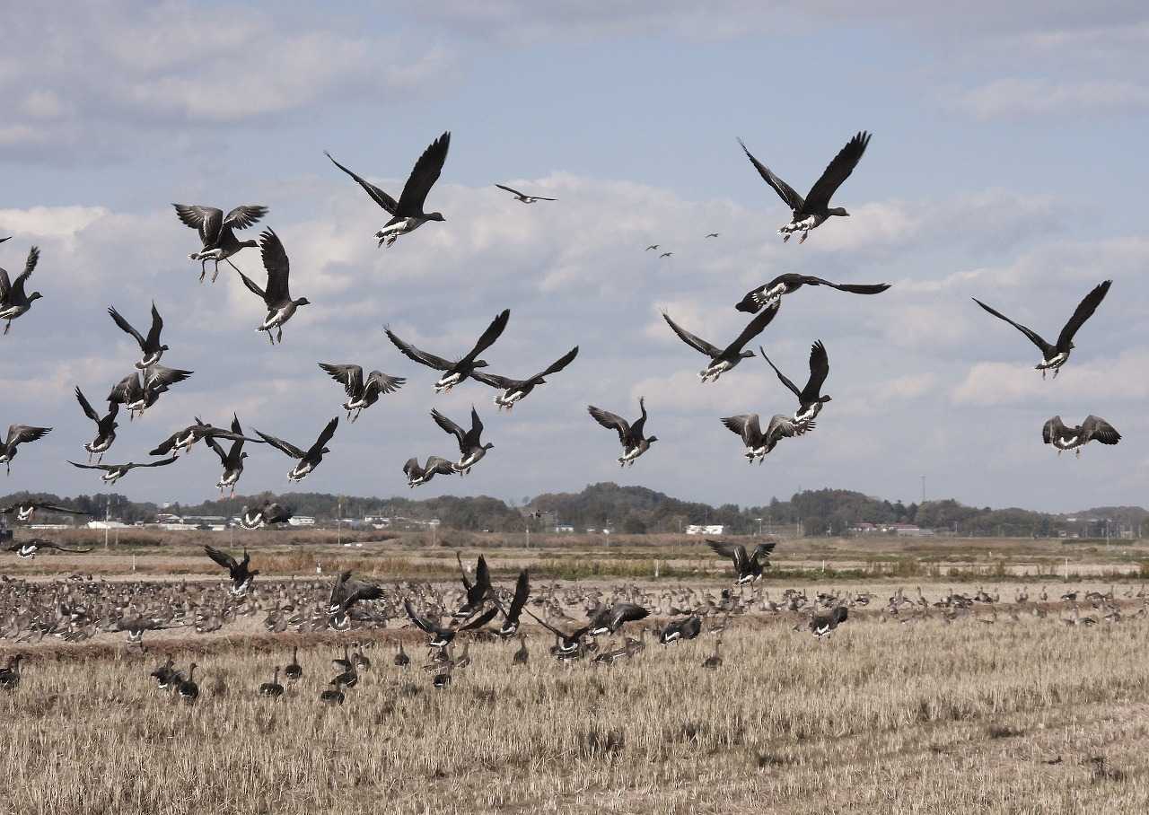 突然、田んぼからがんの大集団が沼に向かって帰ってきました。何かあったのでしょうか。こんなお昼ごろに、大集団で戻ってくるのを見たのは初めてです。