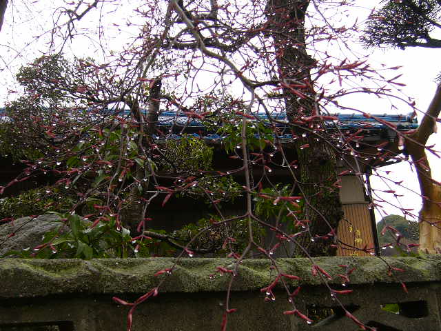雨上がりに庭の草取りをしていると まだ蕾のもみじの先端に水滴が 白くキラキラ光っています。
