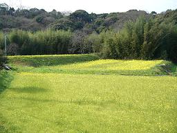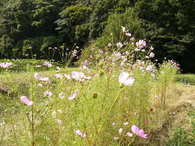 小さな菜の花が田んぼ一面を黄色く染めています。 お天気の良い日に青い屋根の周りを歩いてみました。 モーモーランドに続く道のほうを歩いてみると 歩道の横にきれいに咲く諸葛草 桜も8分位開花し今が見ごろです。 川辺に咲く色鮮やかな桃の花