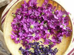 毎朝ハーブ マロウの収穫が日課になっています はじめの1日目は手のひらにのるくらい 約1週間すると手のひらから 零れ落ちるようになりました 写真手前はなんかたち乾燥したマロウです 花はティーにしたりサラダに入れると食卓が華やぎますね 薄青色のティーに レモンを器の縁から少し絞り込むと きれいなピンクに変化するのが楽しみです 青い屋根でマロウティーは楽しめます 庭に可愛いらしく咲いていたチェリーセージ 娘が「仲良くお雛様のようだね」とつぶやきました パン生地を作らないと