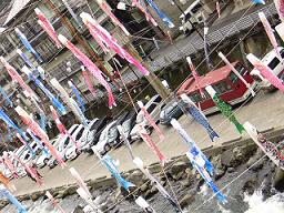 杖立の鯉のぼり この日は風が無くチョツト寂しい鯉のぼり 薬師通りを通り抜けると・・・ 竹の明り取り たくさんの木の葉の形に切り抜かれ 夕暮れともなれば 明かりが灯されるのでしょうか!!!