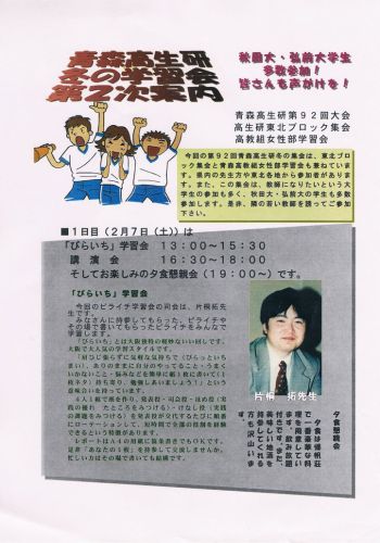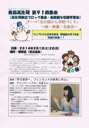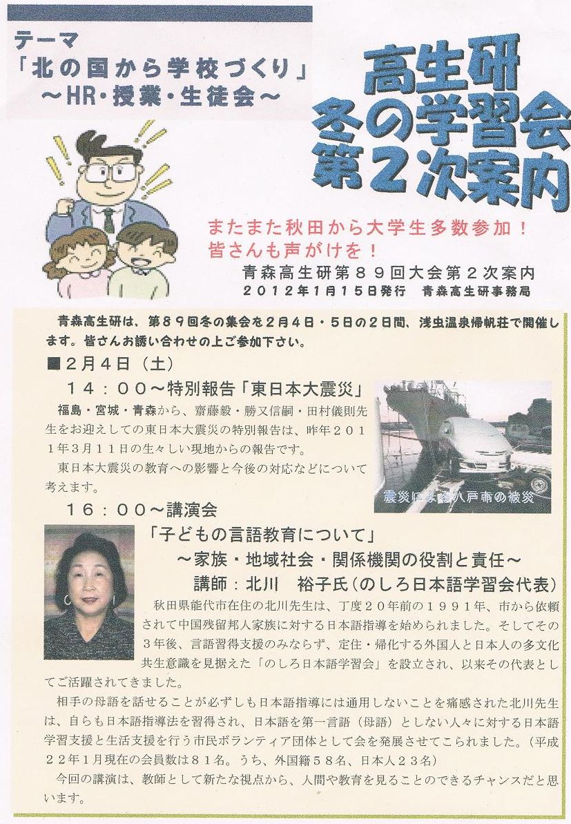 青森高生研冬の集会(第2次案内)のお知らせ冬来りなば春遠からじ。お正月は大雪の青森でしたが、ここしばらくは雪も落ち着き、春3月が待ちどおしい季節となりました。青森高生研の冬の集会は今年も、浅虫温泉帰帆荘で2月の第1週の土日である2月7日(土)、8日(日)に開催を予定しています。(東北ブロックゼミとしても行います)今回は、埼玉から小池由美子先生をお招きし、国語の授業を中心とした教育実践についてお話をいただくことになりました。また、レポート分析は大学生のときから高生研で学び、昨年より新任の教員として奮闘している先生の学級担任の実践について行う予定です。教師は最初から教師ではありません。多くの経験や学習で先生になっていくのではないでしょうか。生徒から学ぶことや、仲間とともに悩み相談していくことで私達は教師としてのボディを鍛え、生徒たちに熱い思いを伝えていくことができるのではないでしょうか。今回の集会には多くの大学生も参加を予定しています。元気と勇気をこの集会でもらって明日の教育実践の礎にしてみませんか。