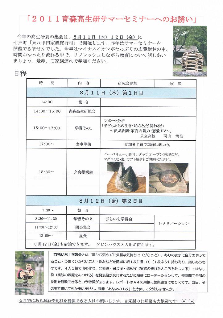 2011年2月5日(土)6日(日)浅虫温泉 帰帆荘 で青森高生研の冬の集会を行います。教師としての学び私たちは、仲間とともに、集い、語り、生徒ひとりひとりの笑顔と希望のために、手弁当でサークル活動を続けています。教育現場では様々な困難なことがあります。ひとりでは解決できないことでも、ひとりで悩むことなく、ときには、激励し、ときには、討論し、自分が教師として、ひとりの人間として、どう生きるべきかそして、こどもたちに何を伝えていくべきなのか?私たちは学んでいかなければならないのではないでしょうか?今年は、大阪から3名の先生方秋田からは、大学生9人を含む12名が参加40名近くの集会になりそうです。教師としてのボディーを鍛えたいという方ともに、語り、学びたいという人は是非、ご参加ください。1日目の、ワークショップ「ぴらいち」と大阪高生研の首藤先生の講演だけであれば飛び入りの参加でもOKです。そのときは、このブログを見たと言ってください。