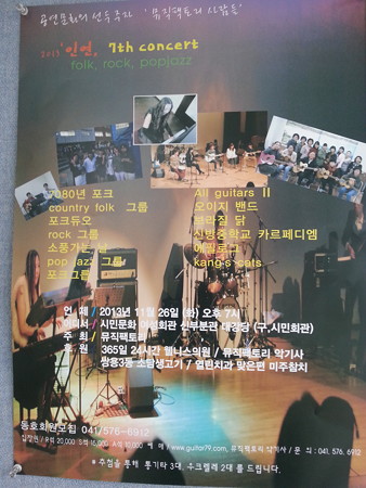 フォト蔵の整理をしてて、写真を取り込んだままでアップしてない記事があったことを思い出した。もう3週間も前のことだわー。教え子さんの招待で、ノギさんと一緒にギターコンサートへ。はんらが教えている住民自治センターのギター教室の講師があちらこちらで教えているメンバーたちのギター発表会。趣味でやってる人たちの発表会だから、観客も、家族や友達ばかりでとてもアットホームな雰囲気だった。前列一番左がはんらの日本語の教え子さん。ギター習って5ヶ月程度。このメンバーは、ギターを始めて1年以下の人たちばかりでまだあんまり上手ではなかったけれど、それでも、習い始めて数ヶ月でこんなふうに舞台に立てるのはスゴイことですよね~!これは、近所のS中学校のバンド。天安市は、SS高校のバンド部がちょっと盛大にやってるんだけれど、このメンバーたちもSS高校に進学予定だと言ってた。バンド活動が続けられそうで良かったね!これはサムスンの音楽サークル。こんな感じで、高校生のペアやアサン市のほうのギターグループ、その他、誰がいたかな?とにかく、8つくらいのグループが3曲ずつくらいを披露。長くやってるというグループはさすがに上手だった。ラストは、講師たちの演奏&歌。住民自治センターの講師は、中央後ろでギター弾いてる人。司会もお上手でした。