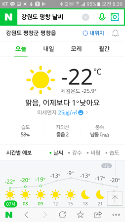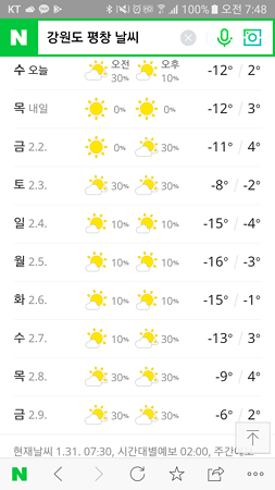 スポーツ以外のことで騒がしい平昌オリンピックがあっという間に目前となった。凍死者が出ないかと心配なお天気だが、韓国は大陸性気候の三寒四温で、気温差が結構、大きい。ネイバーの天気予報は今日含めて10日間出るので、開会式当日、フィギュアスケートは団体競技が行なわれる2月9日の天気予報も出た。平昌のお天気。直前の日曜日~火曜日は最低気温が氷点下15度16度と極寒だが、9日の最低気温は氷点下6度、日中はプラス気温で、幸いなことにちょっと寒さが和らいでる模様。フィギュア団体競技の江陵も、マイナス4度からプラス5度までと、韓国にしては良好。先日、体感温度が氷点下30度以下だった鉄原も、水曜日の午後からは寒さがかなり和らぐ。ソウルも同じく。