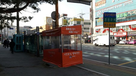 体調がすぐれない時は、うちに娘がいないのが残念無念。はんらの体調が良かろうと悪かろうと、家にはお腹をすかせた息子たちがいる。息子で良かったと思う点は、とにかく肉を食べさせておけば機嫌がいいこと。細かいことには無頓着なこと。具合も悪いのに食事を作りたくないので、授業のあとに、スーパーの近くまで息子たちを呼び出した。バスを待っている人が凍ってしまわないように、最近はバス停ごとにこういうビニールテントが設置された。お昼は、イーマート内の「ジャニーロケット」というハンバーガーのチェーン店へ。マクドナルドなどと比べて高級なハンバーガー屋で、1セットが8000~14900ウォン(800~1490円)ほど。イーマートで、焼くだけの味付け豚肉、洗うだけの生きくらげ、パン(明日の朝は各自、パンを食べてね!)、ラーメン(明日の昼は各自、ラーメンを食べてね!!)などを買い込んで、息子たちに持たせて帰って来た。肉は焼けたし、きくらげも洗った。あ~、しかし、はんらはジャニーロケットが消化されず、またまた晩御飯は食べられそうにないわ~薬、どうしよう。。。
