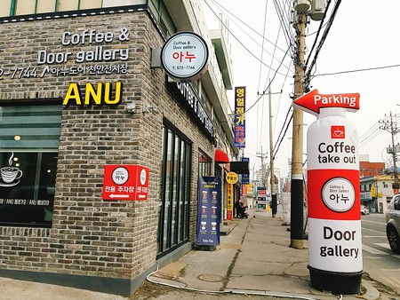 この店は、元々、ドア屋さんだったらしい。今は店内にドアの見本をたくさん置いたままカフェになっている。コーヒー&ドア・ギャラリー「ANU(アヌ)」天安、ポンミョン駅の近く。裏の駐車場のすぐ横は電車の線路。ドアのカタログも置いてあって、ドアの注文も受け付けている。すてきなドアを見ていると、家のリフォームがしたくなってくる。お客さんも結構いて、なかなかいいアイデアのお店かも。コーヒーは、奥さんが淹れるコーヒーがおいしくて、ご主人の淹れるコーヒーはイマイチだという噂。もちろん、同じ価格なんだけど。。。