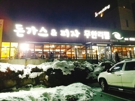 このお店は、はんら家から駅やターミナルに行く時の通り道にできたので、ずっと気にはなっていた。が、この店に行って来た日本語の教え子さんのアジュンマが「トンカツが油っこくて、1個以上は無理だった」などと言うので、それっきりだった。よしくんが行ってみたいというので4人で行ってみた。ノギさんと2人で行ったら元が取れないかもしれないけど、息子たちまで連れて行けば、元が取れないということはあり得ない。イルボン結婚式場の横。安い!大人ランチが980円、ディナーや休日は1050円。今の韓国は、何を食べても最低800円はする。店の名前の割りには、ピザは2種類しかなかった。トンカツ類は、ロースカツ、ヒレカツ、メンチカツ、チキンカツ、チーズカツ、フィッシュカツなど、6種類くらい。そしてここのトンカツはホントに何だか油っこくて、アジュンマには、1個以上は食べられない!はんらは、アジュンマとはいえ、肉や揚げ物が大丈夫な部類。それでもここのトンカツは1個食べたらもういいわという感じだったので、普通のおばちゃんだったら1個も無理かも。それでも、それ以外のメニューが思ったよりたくさんあって、サラダも数種類あり、スパゲティも数種類、オムライスや酢豚、チキン、スイーツも数種類、ナムル、チャプチェ、キムチ、わかめスープなどの韓国食もあり、それなりにあれこれ食べてお腹いっぱいに。これで1050円なら、はんらも充分、元が取れました~コーちゃん、よしくんは、もちろん、6~7回は往復してたので、お金、もったいなくはなかったです。