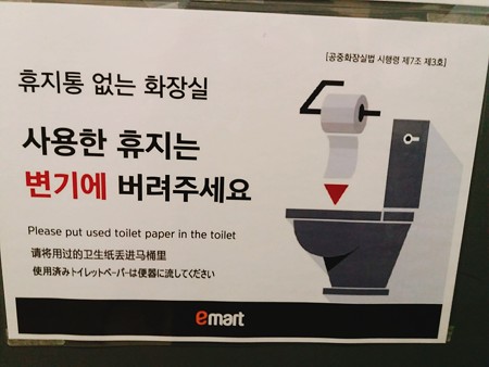 平昌オリンピックを契機に、汚い韓国のトイレを変えましょう、という運動?が始まっている。特に、江原道のような高齢&過疎&田舎のトイレはひどいですからね~韓国の全土から、使用済みトイレットペーパーのコレクションボックスを無くす方向性だ。あれは見た目にも悪く、悪臭の源だもんね。ちなみに、高速道路のサービスエリアにあるトイレは、もう既に、ゴミ箱が撤去されている。汚いものも見えないし、悪臭も無い、きれいなトイレにすっかり大変身している。が、駅のトイレなどは、そういうポスターは貼られているのに、なぜかまだゴミ箱が置かれたままなので、みんなゴミ箱に使用済みペーパーを入れている。そして、たまに、ゴミ箱のないトイレなのに、習慣なのか、ゴミ箱がかつてあった床にそのまま使用済みペーパーが積み上げられているトイレもあって、掃除のおばさんが大層、お気の毒だ。だから、まだゴミ箱が撤去できないのかも?ちなみに、在韓日本人や日本人旅行客は、これまた習慣で、ゴミ箱があってもついつい便器内にペーパーを捨ててしまっていた人が大半だろうと思う。それに、在韓日本人のお宅に遊びに行ってもトイレにゴミ箱を置いている人はごくわずかだ。はんら家もトイレにゴミ箱を置いてないが、なぜかよしくん1人、しょっちゅう、トイレを詰まらせて、頻繁にシュッポシュッポ(何でしょう?あの詰まりを取るヤツ)で格闘している。便の量が多いのか?硬いのか??ペーパーを使い過ぎてるのか???謎だ。近所のイーマートのトイレに貼られているポスターゴミ箱の無いトイレ使用済みのペーパーは便器に捨ててくださいと、書かれている。日本語でも書かれてますね。しかし、ここもやはり、ゴミ箱が置かれたままなので、みんなそのままゴミ箱にペーパーを捨てている。韓国のみんな!早く慣れないと、オリンピックが始まっちゃうよ!このポスターの右上には公衆トイレ法 施行令 第7条第3号と書かれている。「公衆トイレ法」などというものが韓国にはあるらしい。