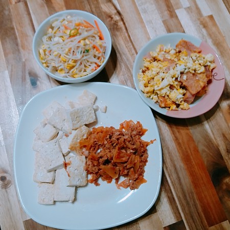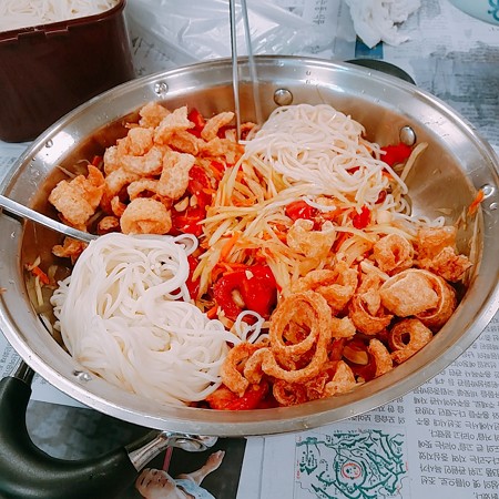 タイ人奥様が目の前で作ってくれた、タイ風麺料理「ソムタム」タイ人奥様が家から持ってきたのは、・キャベツとキュウリの千切り・レモン1個・タレ・茹でた素麺そして、豚の皮のフライこの豚の皮のフライはこのまま食べてもおいしい~ちょっとフライドチキンのような味と香り。タレには、・タイのエクチョ(魚醤のようなもの)・トマト・タイの唐辛子・塩・ピーナッツなどなどが入ってるらしい。レモンを切って絞り、混ぜ合わせます~混ぜ混ぜ。めちゃめちゃ辛い!でもタイの奥様とカンボジアの奥様たちは「何だか辛みも塩加減も足りないわぁ」などと言ってた。意外と、ベトナム人奥様が、「辛すぎる!」と悲鳴を上げていた。韓国人アガシにもこれはおいしいけどちょっと辛すぎるようだった。はんらには無理。(^^;)でも、茹でた白い素麺に具を少しだけ載せて食べたら、味はおいしかった。