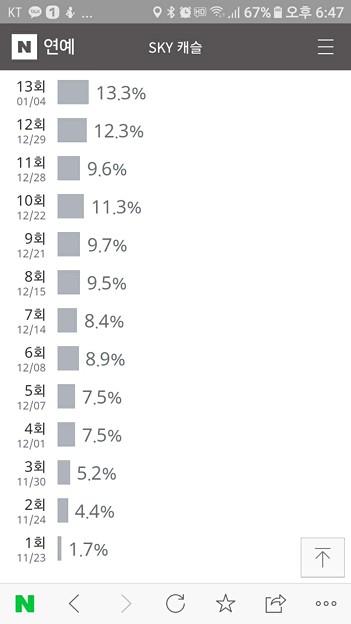 ちょっとこちらをご覧ください。「SKYキャッスル」というドラマの視聴率推移です。第1話が1.7%。第13話では13.3%。見る見るうちにグングン視聴率が上がってます。更に、第18話では22.3%。高視聴率のため、全16話までだったのが4話延長されて、全20話になったそうだ。前に書いたようによしくんにチャンネル権を奪われ最近はニュースもドラマも見てなかったんだけど、こりゃちょっと見てみなきゃ!と思って、先週の土曜日に第18話をリアルタイムで見た。あら、やっぱりおもしろい!ネットで過去あらすじを読み登場人物を確認して、テレビの再放送で16話、17話を見た。ネットでは第1話のみ無料配信。どんなドラマかというと、こちら。韓国の新聞記事を翻訳してみると「大韓民国の上流階層0.1%が暮らすSKYキャッスル(高級ヴィラの名前)で、夫を王のように崇め、子供たちを王子、姫のように育てようとする名高い家柄出身の妻たちの壮絶な欲望をあますところなく見せるリアルコミック風刺ドラマ」我が家にも今年高3受験生になる息子がいるけど、まるで別世界のお話よ~よしくんは、トゥワイスとサッカーとスマホに夢中で、冬休みも、スマホとテレビを交互に見て勉強する姿は皆無。でもいいの。妊娠31週の早産で、脳や目、耳への障害が懸念されたよしくんが、健康に育っただけではんらは満足。有名大学に行かなくたって、自分の関心ある分野の自分の好きな本でも読んでたらいいやん。って思うよ。^^ドラマは毎週金・土曜日の夜11時からJTBCで。JTBCは、今、サッカーアジアカップを中継しているチャンネルで、「SKYキャッスル」を楽しみにしている韓国人たちは「サッカー、早く負けちまえ!」なんて言ってたようですよ。次の試合(カタール戦)が金曜日のドラマの時間帯と重なり、ドラマ放映が延期されてしまうからです。