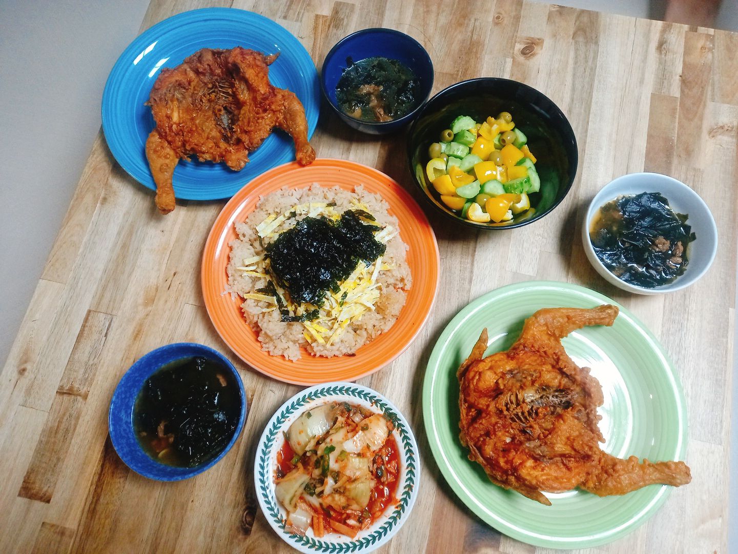 チキンとサラダと炊き込みご飯とワカメスープの晩御飯。