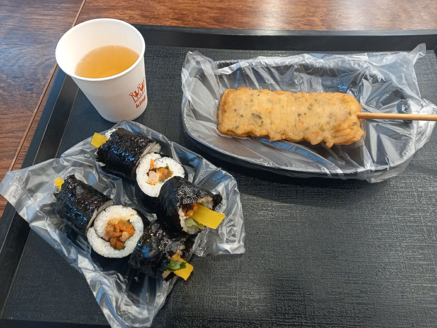 ミニキムパプ(サイズは普通のキムパプの4分の1くらい?)は1本1800ウォン(190円)。