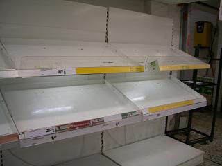 今日はスーパーが半ドンなので早めに出かけたのですが、スーパー近くになると道は渋滞、駐車場はいっぱいでぶつかりそうな勢い。・・・っていうか実際ぶつかっている人発見(苦笑)今までにない混み具合案の定、店内に入ると・・・卵売り場ですが見事に売り切れ残っている物といえば・・・ウズラ卵とイースターの卵(何故?)・・・そら売れ残るわなぁお肉売り場もコレこの通りろくなもんが残っていません店内は混みこみで、めぼしい品物は売り切れ状態だし、なにげに地球最後の日みたいな様相でした。1日休んだら平常通りの営業なのにね。レジもものすご~~い列で、なんか買い物だけで疲れてしまいました