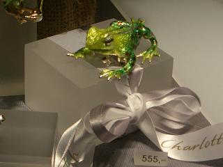 とある宝石屋さんのウインドーにこんな子が・・。カエルちゃんゲコッ指輪のように見えますがあんまり「いらん」なぁ・・。カエルに555ユーロなんて、ねぇでもドイツ人って意外とカエル好き。(本物のカエルではなくてキャラクターもんの方ね)至る所でカエルの置き物やイラストを見かけます。幸せの象徴なのかもあとはブタの置き物やテントウムシなんかも人気ですなぁ