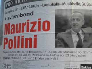 昨日は私の大好きな・・・Maurizio Pollini様のピアノコンサートに行って来ました思い起こせば2年前、ケルンまでわざわざ行って聴きにいったぶり。その時の記事はコチラをどうぞ。今回もポリーニのショパンが聴けると思ったら楽しみで楽しみで前半はプレリュードから始まって、バラードの2番、マズルカ、スケルツォ、ポロネーズを聴かせてくれました。繊細な音とダイナミックな演奏!う~ん、さすが!!休みを挟んで後半はドビュッシー。すんごくキレイな音色で不思議な世界を見せてくれたのですが、私はドビュッシーがチト苦手。何回か違う世界(睡魔??)に行きそうになりましたそれでもアンコールではこれでもかってくらいショパンの曲(しかも大曲)を弾いてくれて、大御所なのにスゴイなぁ・・・と思いました。(・・・っていうかハンブルクの人たちってアンコールしつこいくらいにねばるから☆)ポリーニも今年65歳。あと何年現役でいられるかわかりませんがずっと頑張ってほしいです