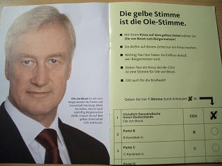 次の日曜日は選挙の日。ある政党の広告冊子がうちのポストにも入っていました。投票の仕方肝心の政策には触れず、投票用紙のサンプルをもちだしてここに印をつけてね~という内容。ドイツでは自分の選ぶものに×印をつけます。↑これはいまだになじめません・・・。次のページも・・延々と続きます。難しいこと考えへんと一番上にいれてや~と言わんばかり。。。。でも・・・国民なんてこんなもん。たまにおもしろい落書きを目にします。ヒットラーのチョビヒゲや、目にモザイクいれたり、この前はビスマルク風のヒゲが書かれていたのを見て吹き出してしまいました政党も政党なら国民も国民ですね・・・。ちゃんちゃん・・・ところでこのおっちゃん、なんていう人なんやろ~~??