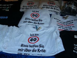 フィッシュマルクトでは衣料品なども売っています。日常品として買う人もいれば、お土産物として買う人も。たいていは「こんなん着る人いるのねぇ~」と思うような物しか売ってないんですが・・。先日こんなTシャツをみつけました。Ich bin 40Bitte helfen Sie mir ueber die Krise「私は40歳です。どうか私の危機を助けてください!」・・・独身なのかしら?でもよく見ると私は30歳バージョンや、50歳、60歳バージョンもあります。そのときどきで「危機」とやらは変化していくのでしょうが・・・。う~ん、着ている人を見てみたい(笑)しかし値段が8.95ユーロってのもなんだか中途半端な8ユーロか9ユーロでいいのにね。