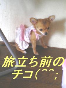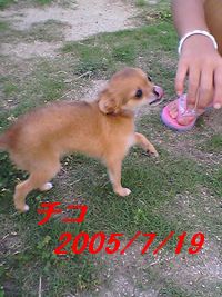 家で産まれた チワワベビー…。チコちゃんが旅立ちを向えました。ちょうど、生後3ヶ月 7/20(水)にお引越しです。・゜・(*ノД`*)・゜・。 新しい家族は 主人の実家ですが、大阪⇒横浜なのでちょこちょこ合えない…。しらないトコに嫁に出すわけじゃないけど、やっぱブルーです。産まれる前から、決まっていたとはいえ、いざ日が決まってしますと、ブルーなきゃみです(〃_ _)σ∥イジイジちょっとチコちゃんの生い立ちを…。2005.4.20(木) PM12:15 誕生生後3時間後の体重70g 4.21 80g毎日スクスク順調に 育って、3日目(夜)には 100g生後1ヶ月では、500g!!! ▽・ェ・▽ノ""わん!今現在900g にまで成長♪心配していた、ララママの育児放棄もなく、母乳で育ち、生後1ヶ月半から、ふやかした、フード…。(歯がちょっとおそかったので)今はすっかり、カリカリフード(^∀≦☆)母犬や、兄弟と3ヶ月びっしり過ごした仔犬は 精神的にも安定するって、TVでもやってたし。ペットショップでは、より小さい仔が売れるから、犬社会が???のままだそう。実際ララはペットショップ出身。生後2ヶ月前に我が家にやってきました。皆、ワンコチャン達がそうとは 限らないですけど、家のララに限っては 「あ~~~自分が犬だって事知らないんだぁ」って、TV見て納得。。。チワワブームの前だったけど、30万!!!そりゃ~~こっちも過保護にしちゃったし。犬達も人の犠牲??なのかなぁ?今後も繁殖して行きたいけど、まだまだどうするか悩み中!真剣にかんがえなきゃね!ひとつの命・・・だから。