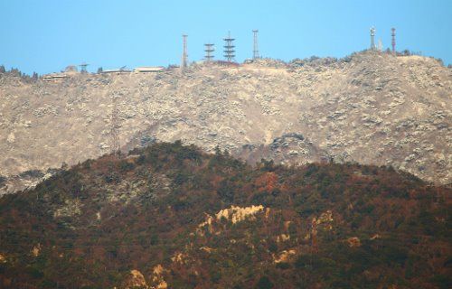 中央の土色の山肌は六甲ロックガーデン地獄谷↓